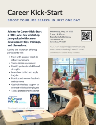 Presented by PA Women Work, in partnership with Senator Camera Bartolotta, Career Kick-Start is a one-day professional development event designed to help job seekers boost their career search