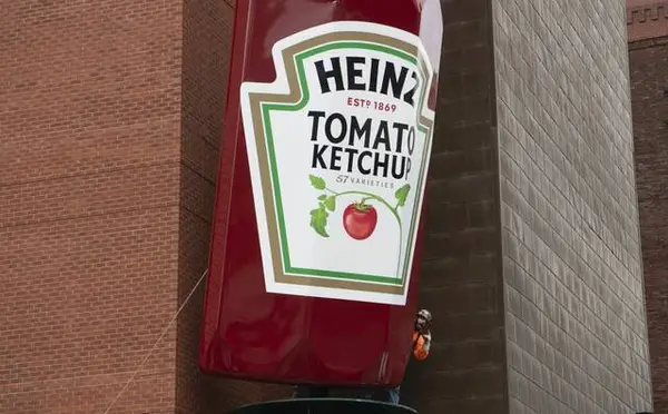 The installation, which will be a day-long project, began at 7 a.m. when the ketchup bottle arrived. The bottle weighs 7,000 pounds and the base is 9.5 feet wide. Approximately 13,000 gallons of Heinz ketchup would fit inside this bottle, according to the History Center. Once the bottle is mounted on the steel pedestal, it will stand at more than 55 feet tall.