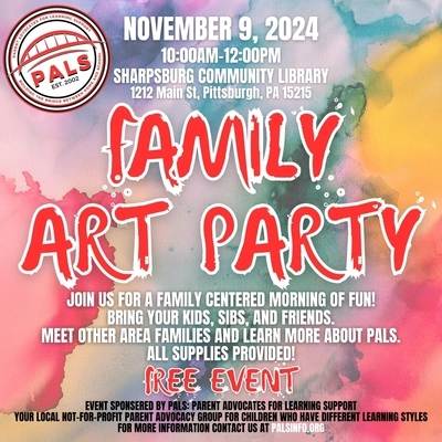 PALS: Parent Advocates for Learning Support welcomes area families for an art party and community. Saturday, November 9, 2024 10am - 12pm at the Sharpsburg Community Library meeting room.