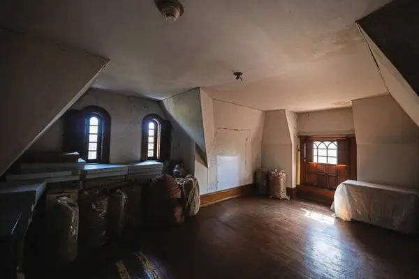 Some rooms in the upper spaces are filled with furniture from other Frick residences while other areas are being utilized as storage for holiday decorations and family heirlooms. The spaces are raw — there is chipped paint, water damage stains and cracking wallpaper. A bell is still attached high on a wall — most likely used to summon the help 24 hours a day.