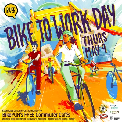Ride a bike over to BikePGH's Commuter Cafés on Bike to Work Day for free breakfast in the AM, snacks and discounted drinks in the PM, and to receive a gift when you become a BikePGH member.
