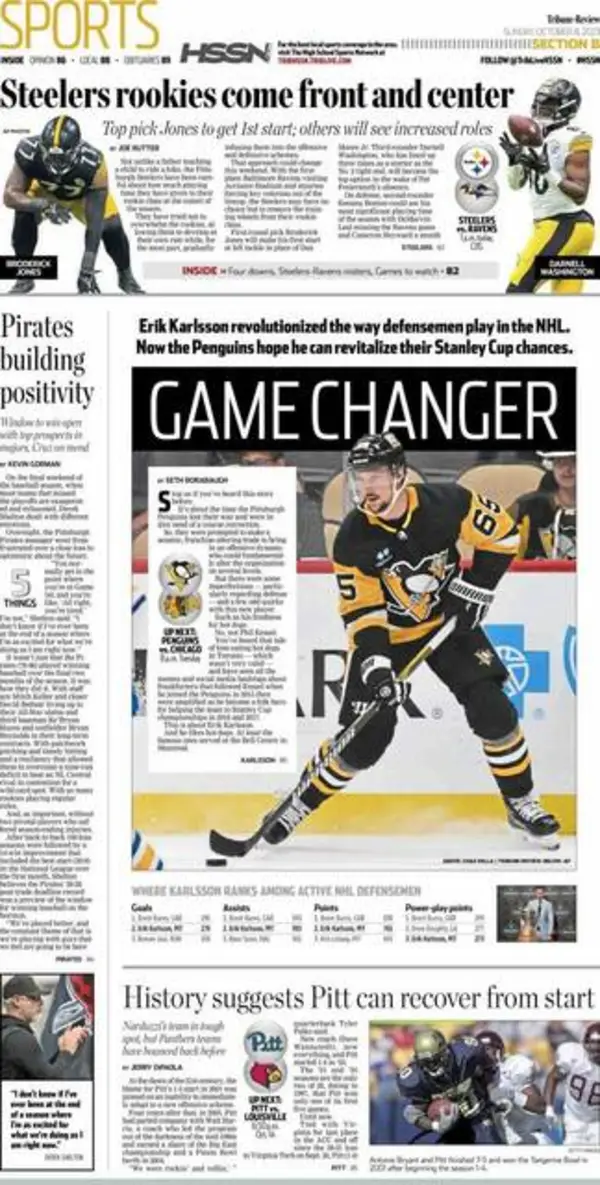 The Trib’s section entry included an NFL season preview, a 1-on-1 interview with Pirates chairman Bob Nutting, an in-depth look at the Penguins’ signing of Erik Karlsson and a college football preview edition.