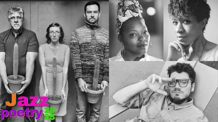 Opening night of Jazz Poetry 2025 features jazz trio Thumbscrew and poets Mahogany L. Browne, Camille Rankine, and Oleksandr Frazé-Frazénko.