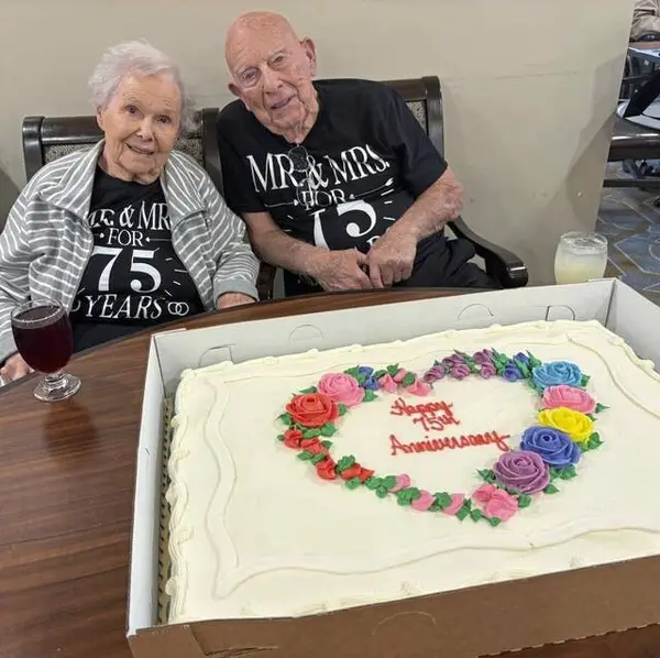That was evident on Sept. 15 as residents at Harmony at Harts Run were treated to cake after lunch, courtesy of Harold and Daisy. Two Giant Eagle desserts — one decorated with a big heart with colorful flowers and “Happy 75th Anniversary” in red — the color of love.