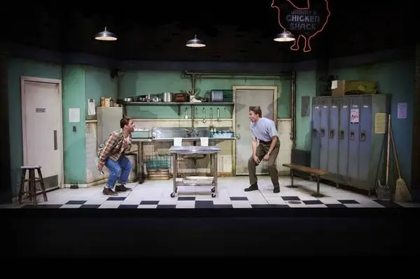 One particularly brilliant combination of writing, direction and production comes with two different quickfire montages, using the “ding” of a restaurant bell and different shades of lighting to denote the passage of time. Lighting designer Levi J. Wilkins shifts the mood with color and brightness, especially poignant in the darker final scenes. And lest we forget the red neon chicken sign that greets the audience upon arrival before the show.