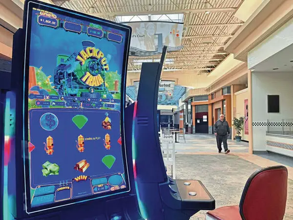 A four-game skills gambling kiosk, each with large, colorful digital displays and an accompanying chair occupy the middle of a corridor that’s visible from Macy’s, Panera Bread and other vacant storefronts.
