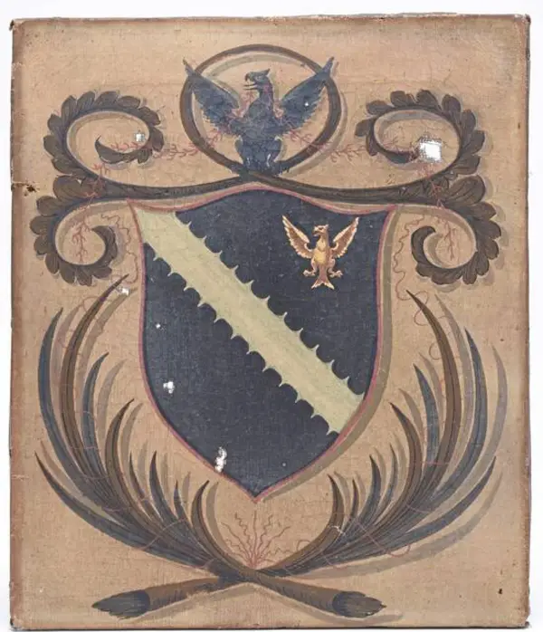 Painted in oil on canvas, the heraldic design dates from the mid-18th century and is about 10 inches wide. It’s expected to fetch at least in the neighborhood of 280 pounds — the equivalent of close to $360 — as part of Halls Fine Art’s militaria auction Aug. 21 in Shrewsbury.