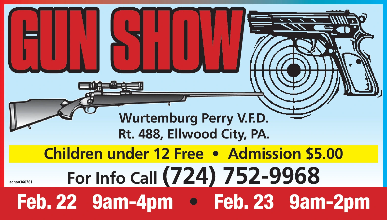 GUN SHOW adno=360781 Wurtemburg Perry V.F.D. Rt. 488, Ellwood City, PA. Children under 12 Free Admission $5.00 For Info Call (724) 752-9968 Feb. 22 9am-4pm Feb. 23 9am-2pm GUN SHOW adno = 360781 Wurtemburg Perry V.F.D. Rt . 488 , Ellwood City , PA . Children under 12 Free Admission $ 5.00 For Info Call ( 724 ) 752-9968 Feb. 22 9 am-4pm Feb . 23 9 am-2pm