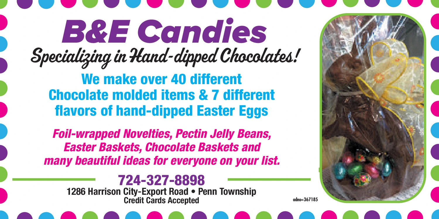 B&E Candies Specializing in Hand-dipped Chocolates! We make over 40 different Chocolate molded items & 7 different flavors of hand-dipped Easter Eggs Foil-wrapped Novelties, Pectin Jelly Beans, Easter Baskets, Chocolate Baskets and many beautiful ideas for everyone on your list. 724-327-8898 1286 Harrison City-Export Road Penn Township Credit Cards Accepted adno=367185 B & E Candies Specializing in Hand - dipped Chocolates ! We make over 40 different Chocolate molded items & 7 different flavors of hand - dipped Easter Eggs Foil - wrapped Novelties , Pectin Jelly Beans , Easter Baskets , Chocolate Baskets and many beautiful ideas for everyone on your list . 724-327-8898 1286 Harrison City - Export Road Penn Township Credit Cards Accepted adno = 367185