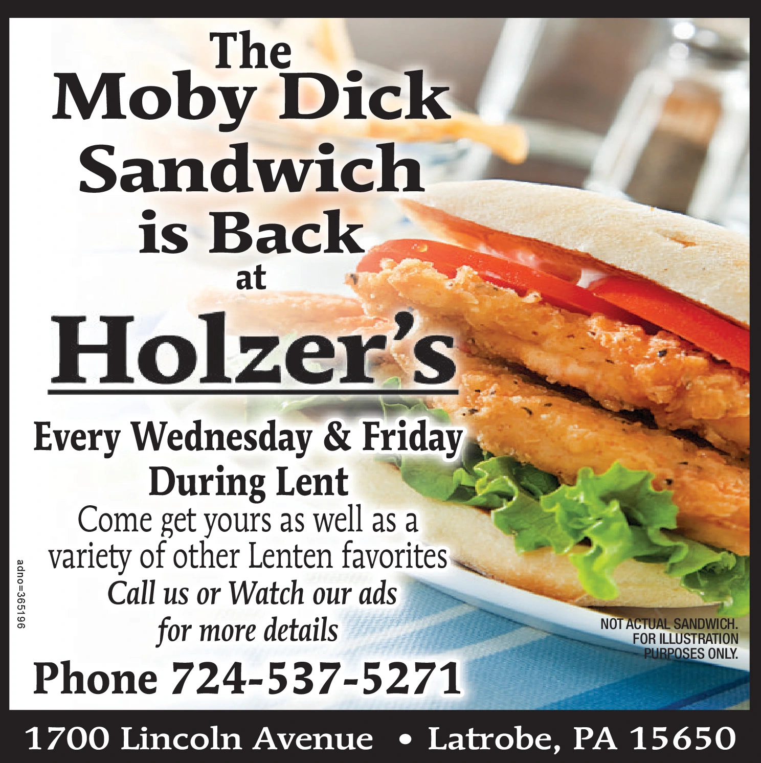 The Moby Dick Sandwich is Back at Holzer's Every Wednesday & Friday During Lent Come get yours as well as a variety of other Lenten favorites Call us or Watch our ads for more details Phone 724-537-5271 adno=365196 NOT ACTUAL SANDWICH. FOR ILLUSTRATION PURPOSES ONLY. 1700 Lincoln Avenue Latrobe, PA 15650 The Moby Dick Sandwich is Back at Holzer's Every Wednesday & Friday During Lent Come get yours as well as a variety of other Lenten favorites Call us or Watch our ads for more details Phone 724-537-5271 adno = 365196 NOT ACTUAL SANDWICH . FOR ILLUSTRATION PURPOSES ONLY . 1700 Lincoln Avenue Latrobe , PA 15650