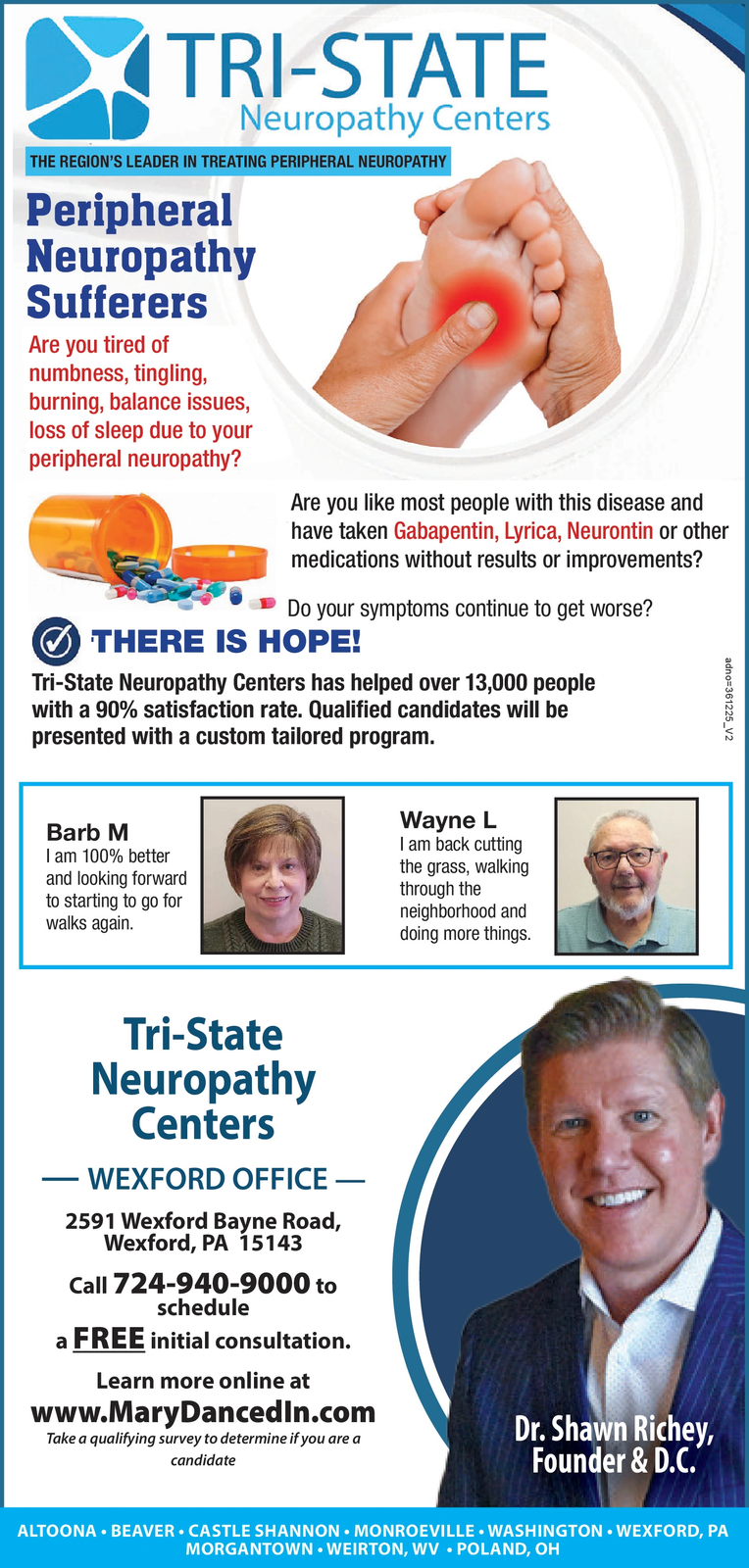 TRI-STATE Neuropathy Centers THE REGION'S LEADER IN TREATING PERIPHERAL NEUROPATHY Peripheral Neuropathy Sufferers Are you tired of numbness, tingling, burning, balance issues, loss of sleep due to your peripheral neuropathy? Are you like most people with this disease and have taken Gabapentin, Lyrica, Neurontin or other medications without results or improvements? Do your symptoms continue to get worse? THERE IS HOPE! Tri-State Neuropathy Centers has helped over 13,000 people with a 90% satisfaction rate. Qualified candidates will be presented with a custom tailored program. adno=360656 Barb M I am 100% better and looking forward to starting to go for walks again. Wayne L I am back cutting the grass, walking through the neighborhood and doing more things. Tri-State Neuropathy Centers - MONROEVILLE OFFICE - 4314 Old William Penn Hwy., Suite 105 Monroeville, PA 15146 Call 724-940-9000 to schedule a FREE initial consultation. Learn more online at www.MaryDancedin.com Take a qualifying survey to determine if you are a candidate Dr. Shawn Richey, Founder & D.C. ALTOONA BEAVER CASTLE SHANNON MONROEVILLE WASHINGTON WEXFORD, PA MORGANTOWN WEIRTON, WV POLAND, OH TRI - STATE Neuropathy Centers THE REGION'S LEADER IN TREATING PERIPHERAL NEUROPATHY Peripheral Neuropathy Sufferers Are you tired of numbness , tingling , burning , balance issues , loss of sleep due to your peripheral neuropathy ? Are you like most people with this disease and have taken Gabapentin , Lyrica , Neurontin or other medications without results or improvements ? Do your symptoms continue to get worse ? THERE IS HOPE ! Tri - State Neuropathy Centers has helped over 13,000 people with a 90 % satisfaction rate . Qualified candidates will be presented with a custom tailored program . adno = 360656 Barb M I am 100 % better and looking forward to starting to go for walks again . Wayne L I am back cutting the grass , walking through the neighborhood and doing more things . Tri - State Neuropathy Centers - MONROEVILLE OFFICE - 4314 Old William Penn Hwy . , Suite 105 Monroeville , PA 15146 Call 724-940-9000 to schedule a FREE initial consultation . Learn more online at www.MaryDancedin.com Take a qualifying survey to determine if you are a candidate Dr. Shawn Richey , Founder & D.C. ALTOONA BEAVER CASTLE SHANNON MONROEVILLE WASHINGTON WEXFORD , PA MORGANTOWN WEIRTON , WV POLAND , OH