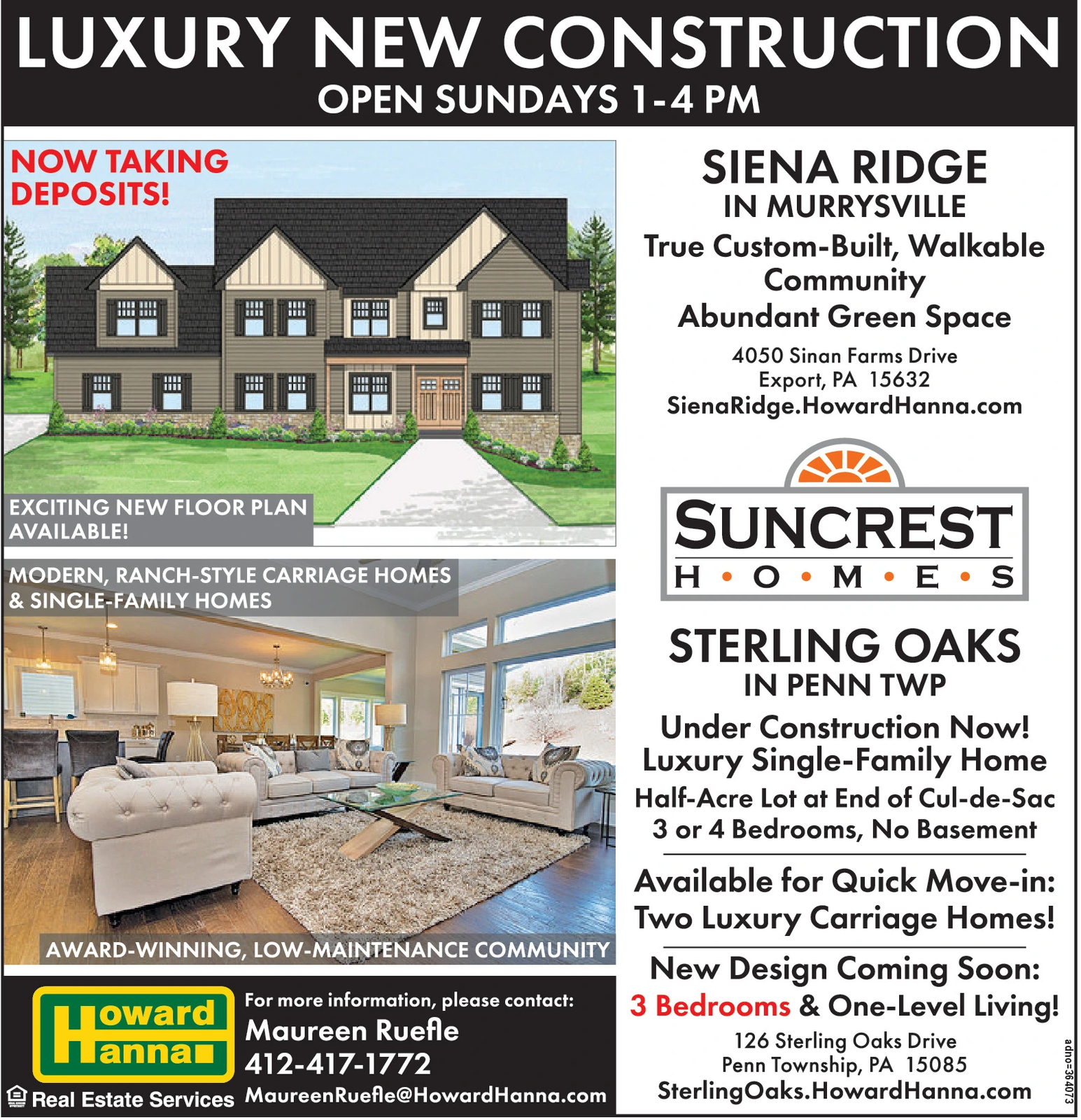 LUXURY NEW CONSTRUCTION NOW TAKING DEPOSITS! OPEN SUNDAYS 1-4 PM SIENA RIDGE IN MURRYSVILLE True Custom-Built, Walkable Community Abundant Green Space 4050 Sinan Farms Drive Export, PA 15632 Siena Ridge.HowardHanna.com EXCITING NEW FLOOR PLAN AVAILABLE! MODERN, RANCH-STYLE CARRIAGE HOMES & SINGLE-FAMILY HOMES AWARD-WINNING, LOW-MAINTENANCE COMMUNITY oward Howa anna For more information, please contact: Maureen Ruefle 412-417-1772 Real Estate Services Maureen Ruefle@Howard Hanna.com SUNCREST HOME S STERLING OAKS IN PENN TWP Under Construction Now! Luxury Single-Family Home Half-Acre Lot at End of Cul-de-Sac 3 or 4 Bedrooms, No Basement Available for Quick Move-in: Two Luxury Carriage Homes! New Design Coming Soon: 3 Bedrooms & One-Level Living! 126 Sterling Oaks Drive Penn Township, PA 15085 Sterling Oaks.HowardHanna.com LUXURY NEW CONSTRUCTION NOW TAKING DEPOSITS ! OPEN SUNDAYS 1-4 PM SIENA RIDGE IN MURRYSVILLE True Custom - Built , Walkable Community Abundant Green Space 4050 Sinan Farms Drive Export , PA 15632 Siena Ridge.HowardHanna.com EXCITING NEW FLOOR PLAN AVAILABLE ! MODERN , RANCH - STYLE CARRIAGE HOMES & SINGLE - FAMILY HOMES AWARD - WINNING , LOW - MAINTENANCE COMMUNITY oward Howa anna For more information , please contact : Maureen Ruefle 412-417-1772 Real Estate Services Maureen Ruefle @ Howard Hanna.com SUNCREST HOME S STERLING OAKS IN PENN TWP Under Construction Now ! Luxury Single - Family Home Half - Acre Lot at End of Cul - de - Sac 3 or 4 Bedrooms , No Basement Available for Quick Move - in : Two Luxury Carriage Homes ! New Design Coming Soon : 3 Bedrooms & One - Level Living ! 126 Sterling Oaks Drive Penn Township , PA 15085 Sterling Oaks.HowardHanna.com