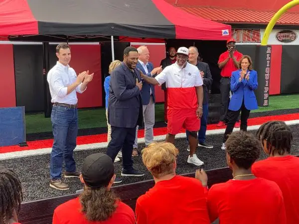 Bettis introduced Second Gentleman Doug Emhoff to the high school football players. Bettis said he was a lot like Emhoff since they both love football, are dedicated to their children and married strong women.