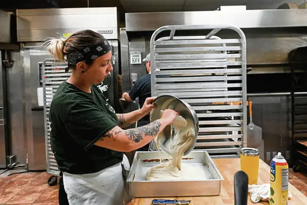 Last Thursday, production manager Joyann Pfeifer was leading a team of bakers to create the masterpiece. The ingredients call for 100 pounds of flour, 60 pounds of sugar, 50 pounds of eggs, 160 pounds of powdered sugar and 80 pounds of shortening.