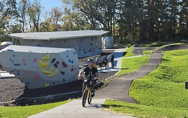 County officials cut the ribbon on a newly built bouldering park and pump track, next to the existing skate park at Boyce Park in Monroeville.