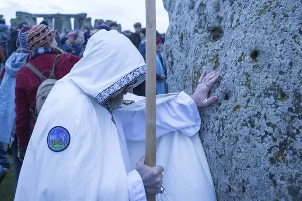 Revelers cheered and beat drums as the sun rose at 8:09 a.m. over the giant standing stones on the winter solstice — the shortest day and the longest night in the Northern Hemisphere. No one could see the sun through the low winter cloud, but that did not deter a flurry of drumming, chanting and singing as dawn broke.