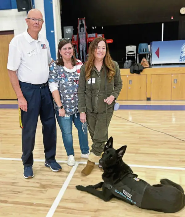 Retired Army Capt. Tammy Watson attended the assembly with her German shepherd, T.J.