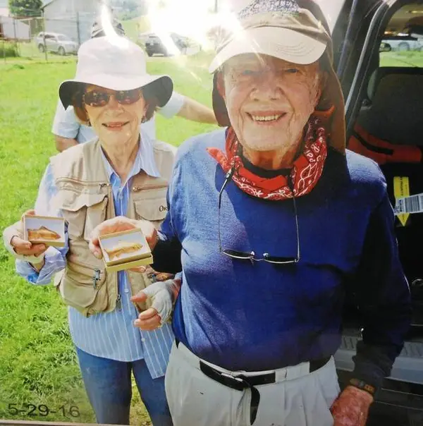 “Dusty told me that she (Rosalynn) was so pleased with the pins that she put hers on her hat right away. I got a handwritten, thank-you from them,” and a picture of the Carters on a wooden bridge over a creek, Cross said.