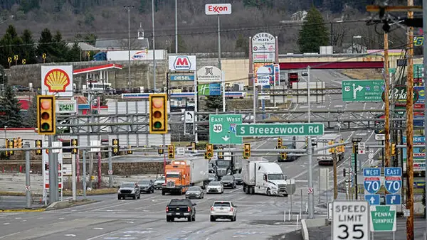 In 2022, according to turnpike statistics, 2.65 million vehicles exited the toll road at Breezewood and 2.83 million entered there. Trucks accounted for 37% of that traffic.