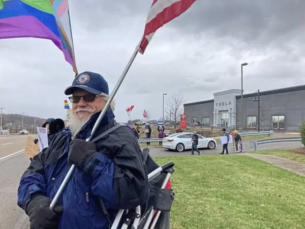 Darryl Wolfe, 55, of Ohioville in Beaver County, held American and pro-Trump flags in a show of support for the president and for Tesla.