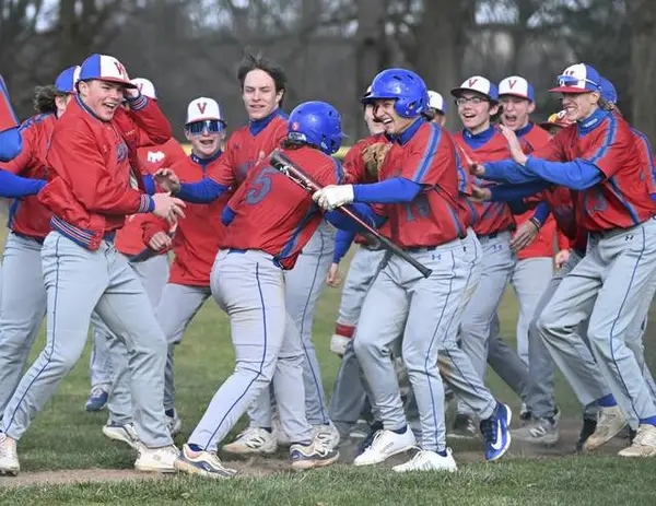 Dane Firmstone’s unconventional homer was one of two hits in the second for the Mt. Pleasant senior, who earlier doubled and scored as the Vikings sent 14 batters to the plate against three Freeport pitchers.