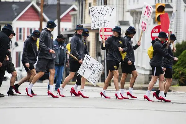 Dozens of male athletes took to the streets of Greensburg Saturday — in high heels.