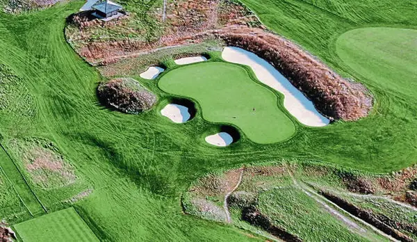The green is nestled behind grassy ditches and contours that will make for some interesting bounces on approach shots.