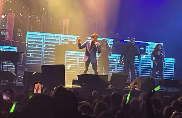 But the ballads weren’t far behind, “Somewhere in the Night” and “Looks Like We Made It,” a crowd favorite, both featured his still-pack-a-punch vocals and a sweet sincerity. For the syrupy-sweet “Can’t Smile Without You,” he even provided karaoke-style lyrics on the screen at the back of the stage so the audience could sing along, waving their handed out glowsticks throughout the arena in wide, greenish back-and-forth arcs.