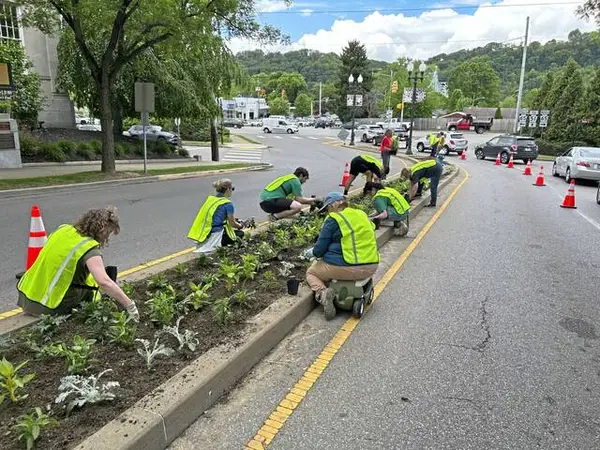 Nearly 20 volunteers and three borough public works laborers spent the morning of May 14 planting about 4,000 flowers in the islands of the major roadway.
