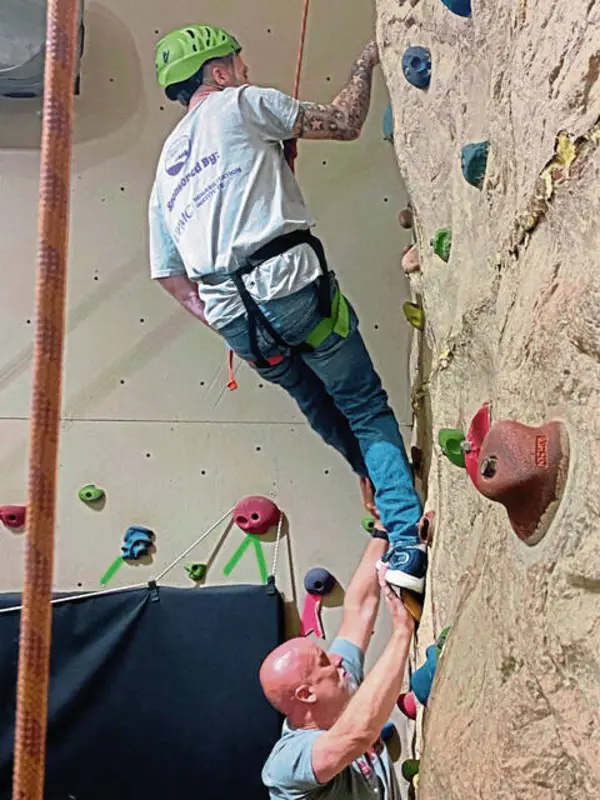 After getting a little help with his footing, Jay Perino used his legs to push his body up the rock wall, reaching for the closest handhold.