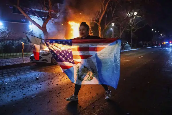 The post was accompanied by a photo of a protester standing on top of a burning car waving a Mexican flag, with other cars engulfed in flames nearby.