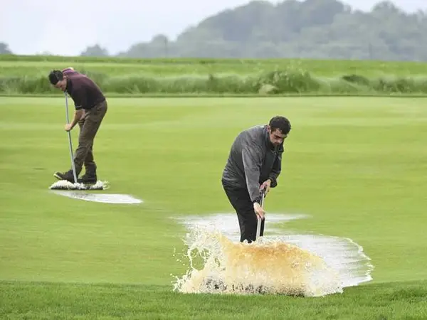 The rain, which was heavy at times, turned areas of the historic course soggy, but the USGA was able to restart the round Sunday after a 96-minute delay rather than postpone. Once groundskeepers swept the water from the low areas, play resumed.