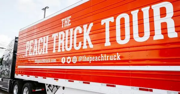 The Peach Truck vehicles pick up peaches from three different farms and deliver them to 25 states between June and August, shuttling back and forth to bring fresh peaches to customers nationwide.