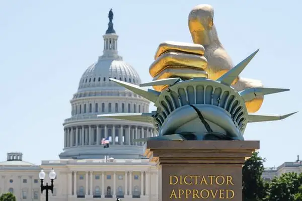 The sequel is an 8-foot-tall sculpture showing a gold-painted thumbs-up squashing the crown of the Statue of Liberty, The Washington Post reported.