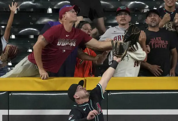 The D-backs were leading 3-2 in the eighth inning Monday when San Francisco’s Christian Koss hit a long fly ball to left field. Arizona left fielder Tim Tawa tried to make a leaping grab, but the fan made the catch with his own glove, appearing to reach over the fence.