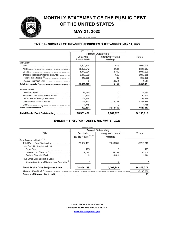 The national debt is the amount of U.S. Treasury securities that are outstanding. As of May 31, it was $36.2 trillion.