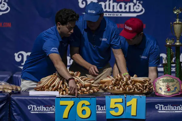 Defending champion Miki Sudo, 39, of Tampa, Florida, won the women’s competition and her 11th title on Friday, downing 33 dogs and buns. Last year, she consumed a record 51 dogs.