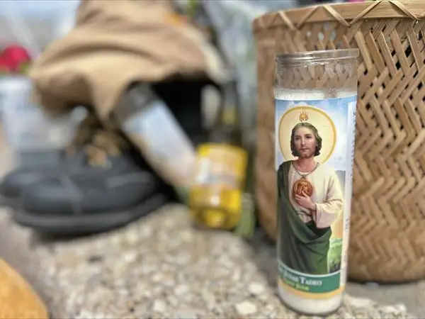 A set of black rosary beads were draped near a card signed “In loving memory, XOXO.” One visitor left a votive candle wrapped in a portrait of Saint Jude, the Christian patron saint of lost causes.