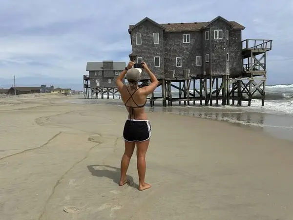 Two homes on the North Carolina Outer Banks sit precariously in the high waves with their days seemingly numbered. Since 2020, 11 neighboring homes have fallen into the Atlantic Ocean.