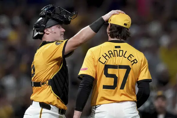 Both are products of the Pirates’ 2021 MLB Draft class, when Davis was taken No. 1 overall and Chandler was chosen in the third round. They were roommates early in their career but had never been teammates until Chandler was called up to Indianapolis last summer. The duo discussed being battery mates for Chandler’s debut and looked forward to the fun.