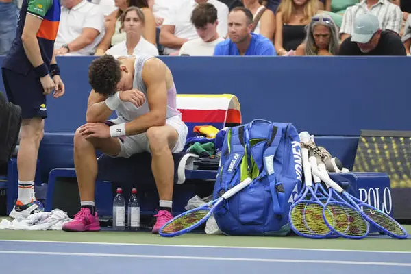 Shelton landed on his left arm after lunging to track down a ball in the corner on the final point to win the third set. Early in the fourth, the 2023 U.S. Open semifinalist began wincing and said to his coach’s box: “I did something to my shoulder. I don’t know what it is.”