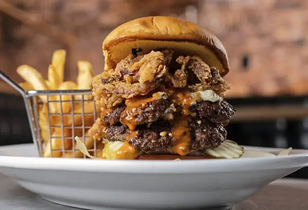 Other entrees include the great hambino sandwich — a ham and cheese sandwich topped with pickle slaw — and the Buffalo blue cheeseburger — smashburger patties dressed in buffalo sauce and crumbled bleu cheese.