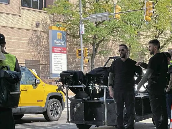 Behind the ambulance, Emmy-winner Noah Wyle, playing Dr. Robby, rides a motorcycle as cameras roll for the first of three days of filming for the show’s second season in Pittsburgh. (Most of HBO Max’s “The Pitt” films in Burbank, Calif.)