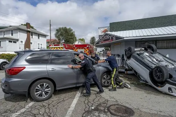 An SUV rolled over and landed in the front porch of Gunny’s Lounge in New Kensington on Tuesday afternoon, sending two people to the hospital.