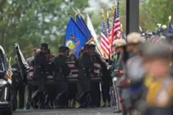 The procession wound from the funeral home down Cape Horn Road to Living Word under a gray sky. People lined the route, standing in the rain, waving flags. At the church, the detectives’ flag-draped caskets were carried to the front of the sanctuary. Soft music played as the 1,500-seat auditorium filled with family, friends and law enforcement from all over the state and region. Gov. Josh Shapiro attended.