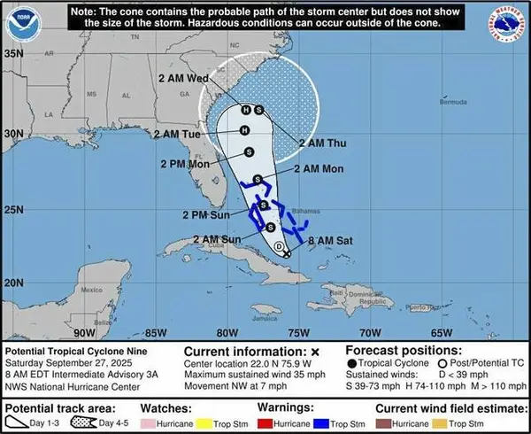 The National Hurricane Center’s official forecast track calls for the new system, now dubbed Tropical Depression Nine, to become a tropical storm by Saturday night, then briefly a hurricane by early next week off the Florida coast. The forecast calls for it to slow and weaken as it approaches the South Carolina coast on Monday and Tuesday, and could spend almost 24 hours in virtually the same location just offshore.