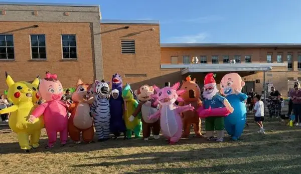 Teacher Savanna Barton, in an air-filled costume, sprinted to first place in the second annual Mystery Inflatable Teacher Race, a fundraiser held Sept. 10 by the school’s Parent Teacher Organization.