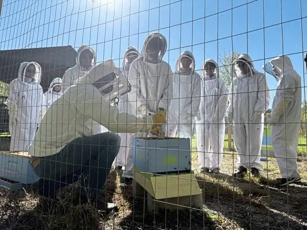 Science teacher Patrick Roberts demonstrates beekeeping to his @GLSDwildcats high school seniors on Thursday at Latrobe Rotary Community Park.@TribWestmoreCo@TribLIVEpic.twitter.com/iWvP30FMzQ