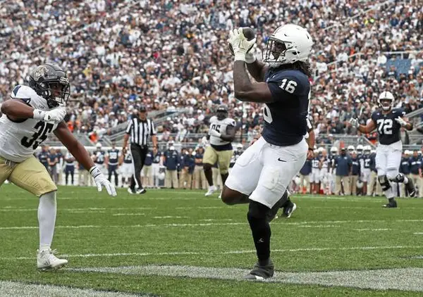 Veteran Khalil Dinkins caught a 40-yard touchdown pass from Drew Allar, but he was called for a 15-yard unsportsmanlike conduct penalty at the end of the play.