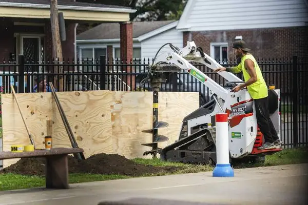 Thick poles are being filled with concrete and drilled into the ground. The cost of the project is unclear.